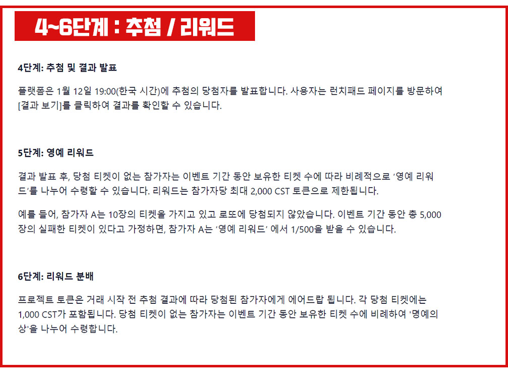 • 당첨이 되지 않더라도 자신이 가지고 있지 않던 총 티켓수와 전체적으로 당첨이 안된 총티겟수에 비례하여 CST를 받을 수 있다고 하니 당첨이 안되도 실망하지 말자!
