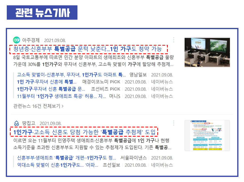 2021년 하반기 국토부 보도에 따르면 무주택 실수요자 특별공급 청약기회를 확대하겠다고 발표하였다. 생애최초, 신혼부부 특별공급 30% 추첨제가 본격화되면서 올해부터 1인가구 혹은 소득이 많거나 자녀가 없는 신혼부부도 특별공급 청약이 가능하도록 보완하였기 때문에 무주택자들의 기대가 크다. 다만 DSR규제 강화로 잔금대출이 어려워질 수 있어 청약에 나서기 앞서 꼼꼼한 자금계획이 필요해 보인다.