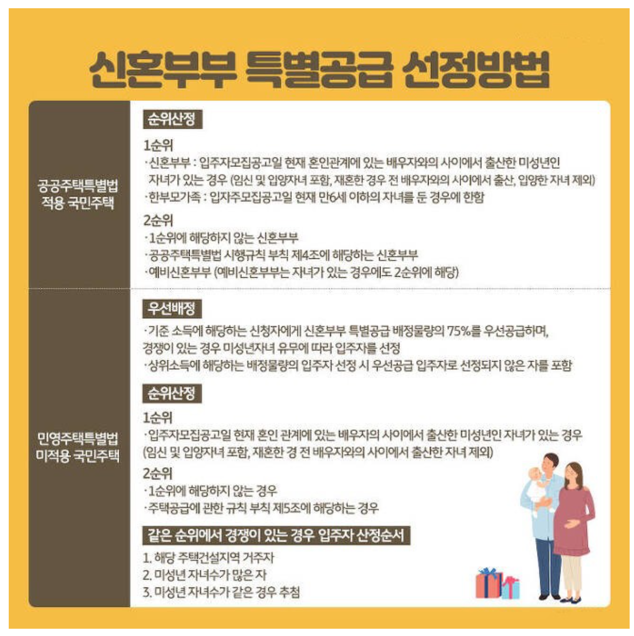 - 기준 소득에 해당하는 신청자에게 신혼부부 특별공급 배정물량의 75%를 우선공급하며, 경쟁이 있는 경우 미성년자녀 유무에 따라 입주자를 선정