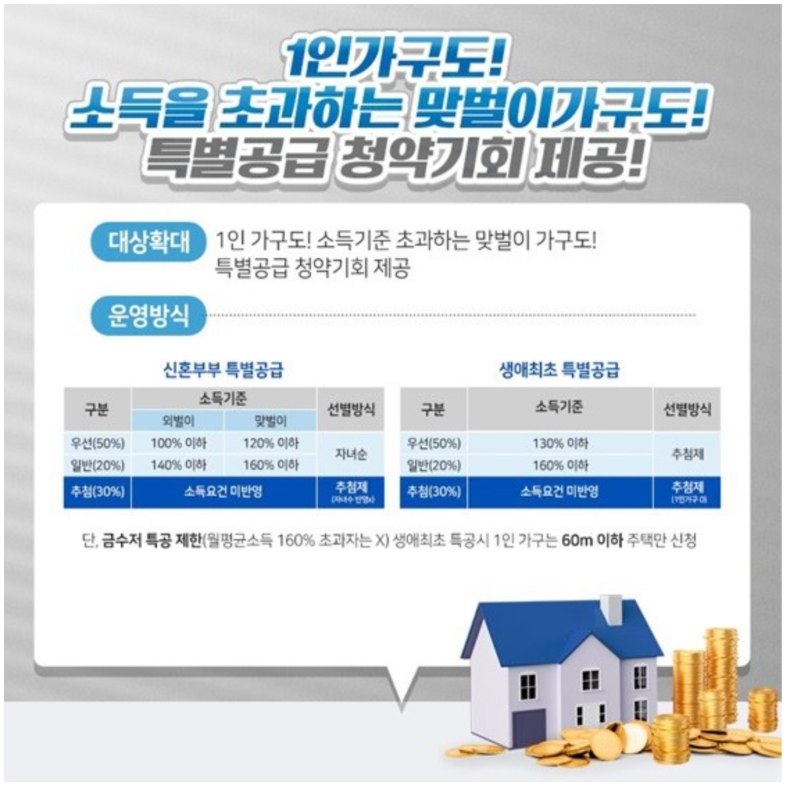 단, 1인가구의 경우 (60㎡이하의 주택만 신청 가능하다)