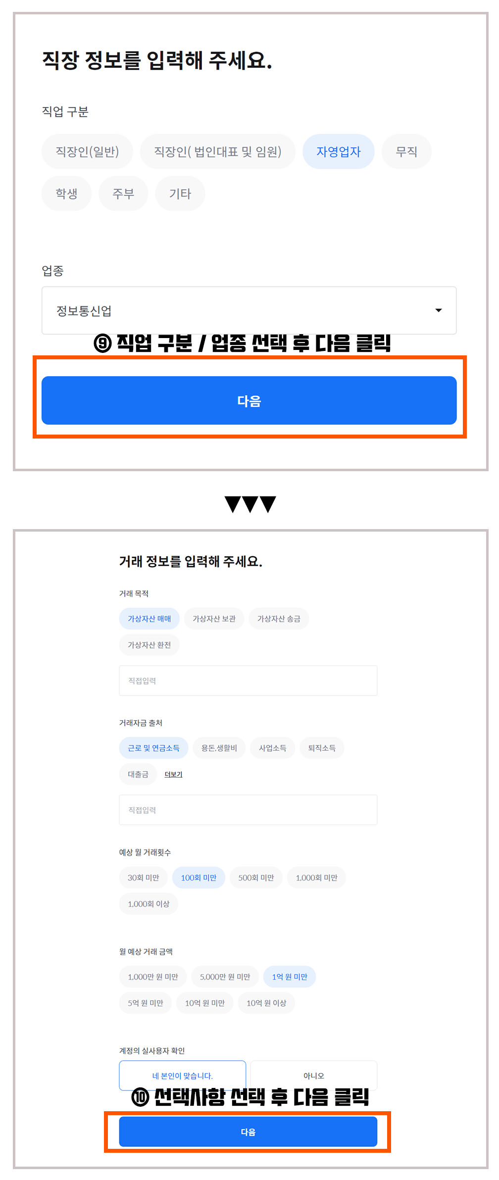그 다음 본인이 해당하는 직업 정보와 거래 정보를 대략적으로 체크하고 다음을 클릭한다.