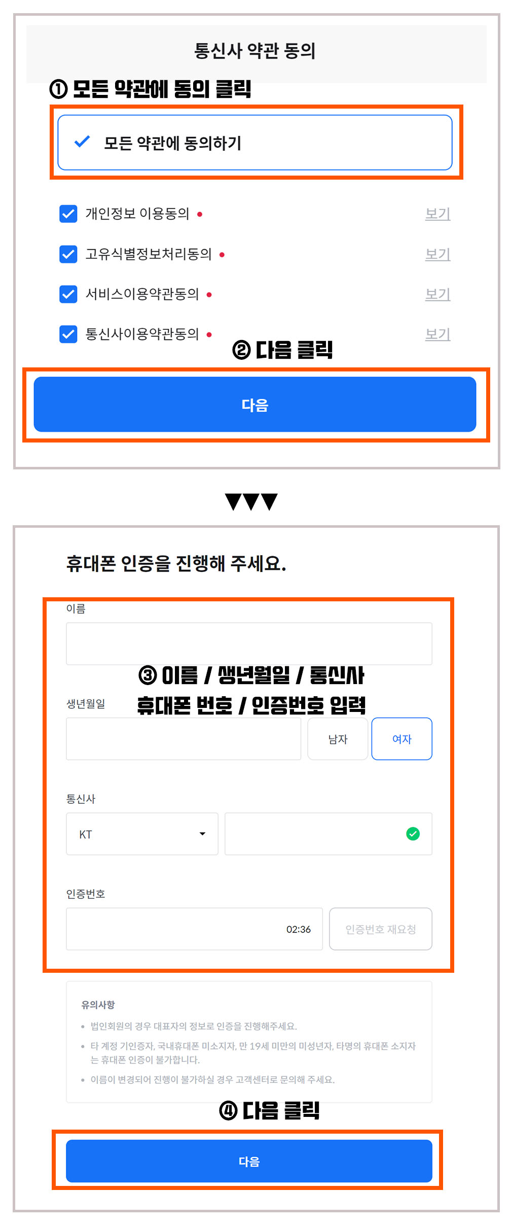 스마트폰 인증을 위해 약관에 동의하고 이름 / 생년월일 / 통신사 / 휴대폰 번호 / 인증번호를 입력하여 인증을 완료한다.