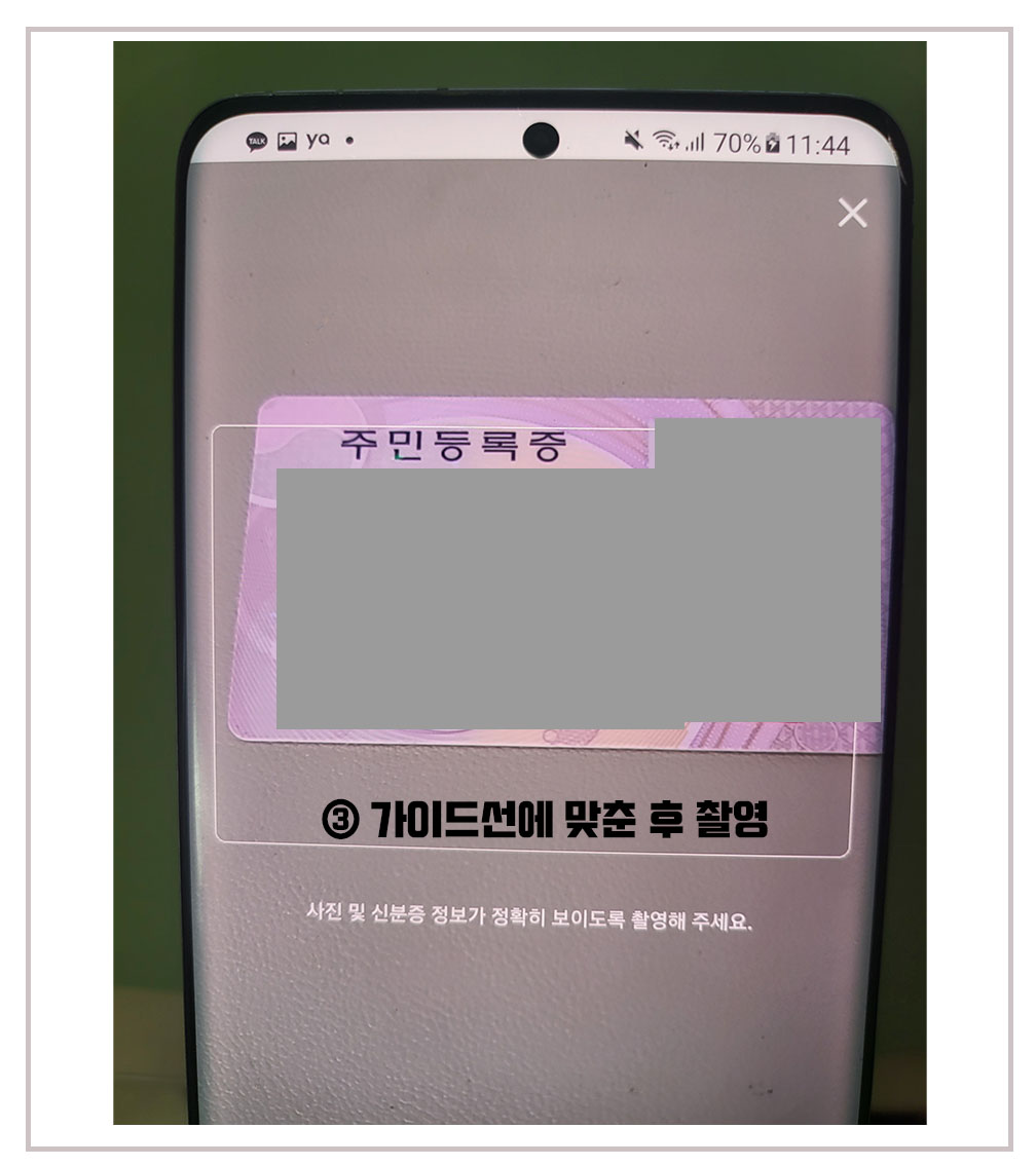 신분증 촬영 시 바닥이 어두운 곳에 반듯하게 놓고 촬영하면 된다.