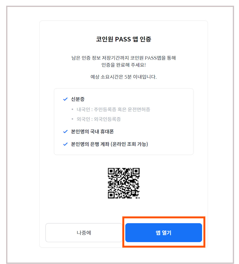 인증이 완료가 되어야 거래를 할 수 있기 때문에 본인인증 진행 안내문이 나온다. 이 때 인증하기 버튼을 누른다.
