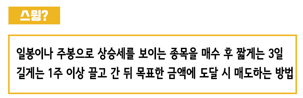 스윙은 단타라고 보면되고 일봉이나 주봉으로 상승세를 보이는 종목을 매수 후 짧게는 3일, 길게는 1주 이상 끌고 간 뒤 목표한 금액에 도달 시 매도하는 방법이다.