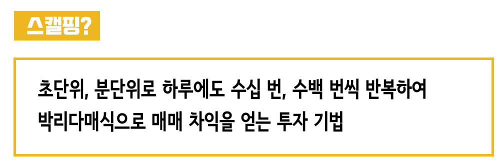 보통 단타라고 하면 매수 후 2-3일 이내에 다시 매도하는 것인데 단타보다 더 빠른 초단위, 분단위로로 하루에도 수백 번씩 반복하여 박리다매식으로 매매 차익을 얻는 투자 기법이다.