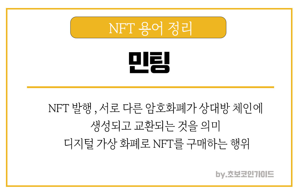 민팅은 주로 NFT쪽에서 쓰이며 NFT를 발행, 서로 다른 암호화폐가 상대방 체인에 생성되고 교환되는 것을 의미한다. 블록체인 자산을 생성하는 과정으로 '마인팅'으로도 읽는다.
