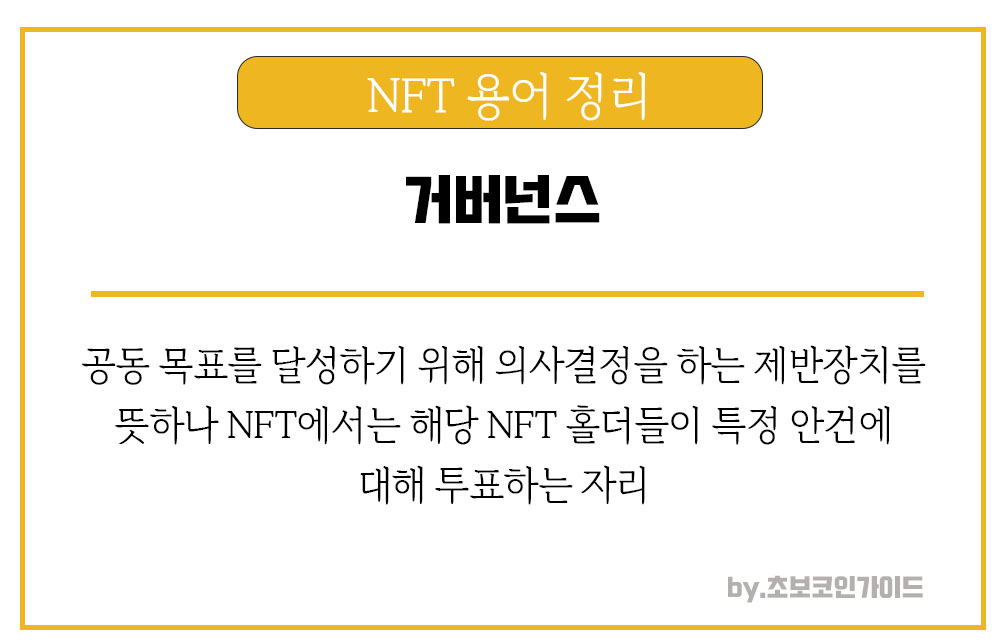 사전상의 뜻은 공동의 목표를 위해 의사결정을 하도록 만들어진 제반장치를 뜻하나 NFT에서는 해당 NFT 홀더들이 특정 안건에 대해 투표를 하는 자리이다. 거버넌스 내용에 따라 가격이 변동되기도 한다.