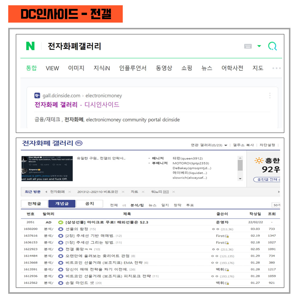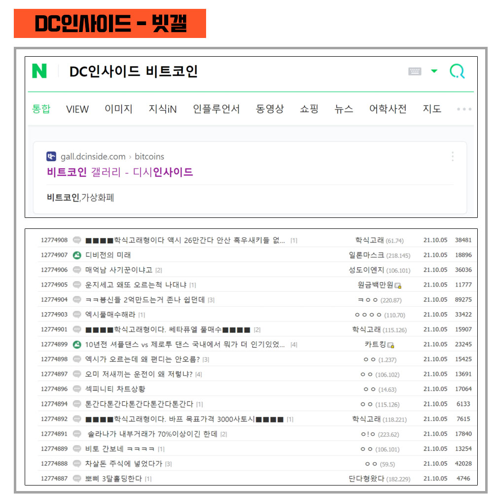 절박한 개미투자자들의 심정을 적나라게 알 수 있다. 올라오는 게시글들을 보면 자신이 산 코인이 오르기를 희망하는 글, 또는 돈을 많이 잃었을 때 한풀이 글, 무지성 매수를 선동하는 글들이 대부분이다. 초보자가 보면 오히려 분위기에 휩쓸려 무지성 매매하기가 좋으니 깊게 읽지 않는 것을 추천한다.