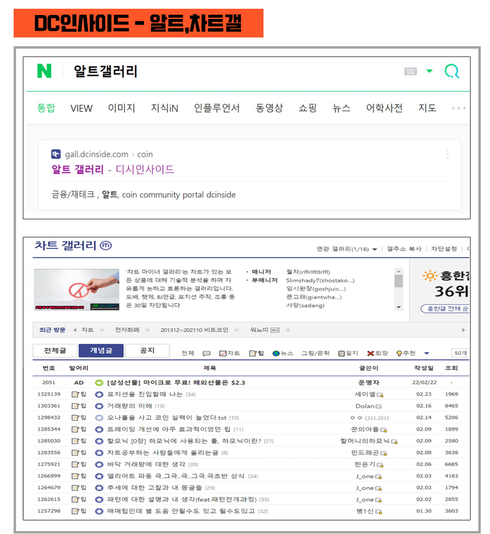 디시인사이드에서 알트, 차트 갤러리가 코인 공부하기에는 오히려 좋은 것 같다. 만약 내가 아주 초보라면 알아 듣기 어려운 단어들이 많으나 오히려 보면서 공부할 수 있기도 하다.