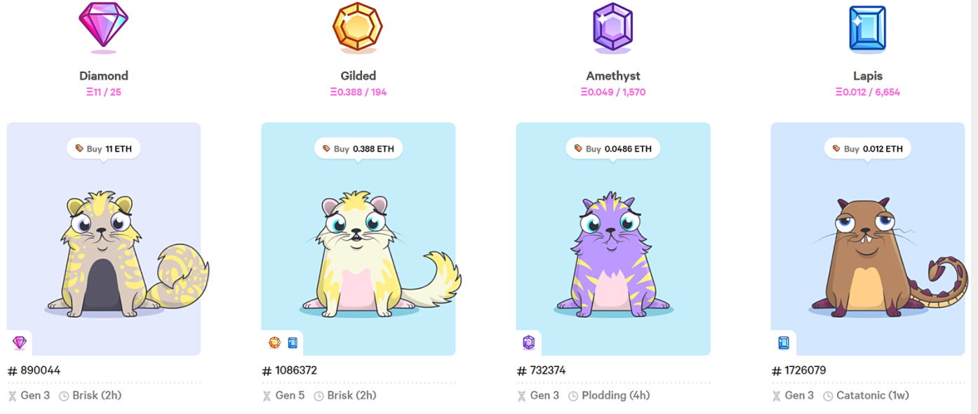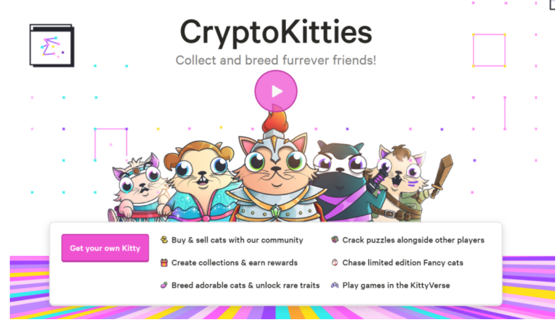 2017년 11월에 출시돼어 선풍적 인기를 끌면서 이더리움을 마비시킬 정도였다. 크립토키티는 디지털 고양이를 수집하거나 교환할 수 있는 펫 수집, 키우기 게임의 일종이다.