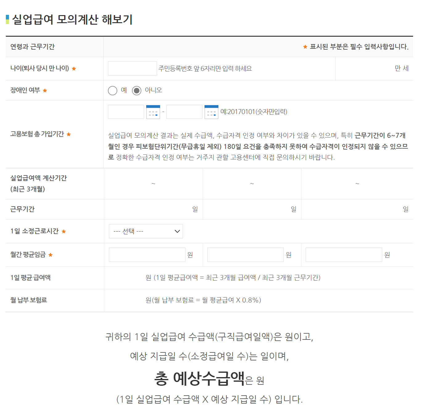 실업급여 모의계산 해보기 귀하의 1일 실업급여 수급액(구직급여일액)은 원이고, 예상 지급일 수(소정급여일 수)는 일이며, 총 예상수급액은 원 (1일 실업급여 수급액 X 예상 지급일 수) 입니다.