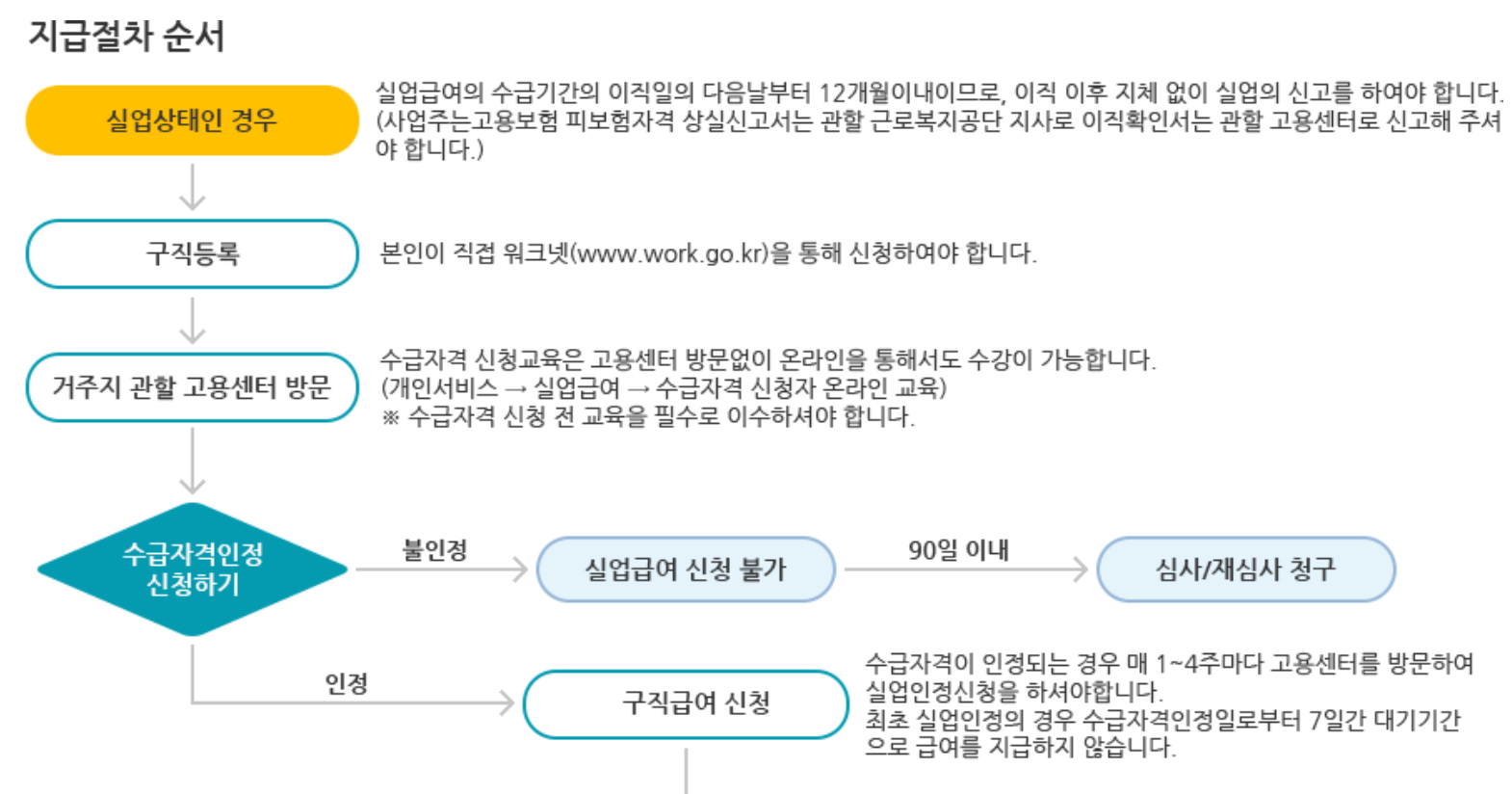 → 수급자격 인정심사 진행 → 자격 인정 시 구직급여 신청 → 구직활동하면서 구직급여 수급