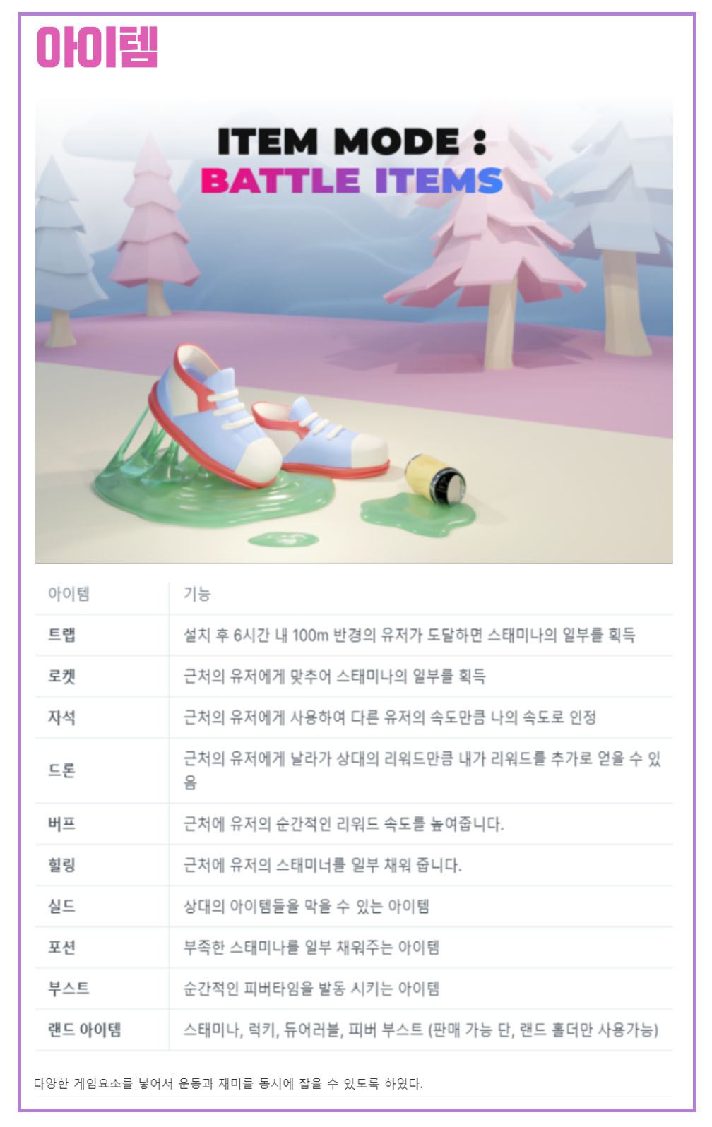 다양한 게임요소를 넣어서 운동과 재미를 동시에 잡을 수 있도록 하였다.