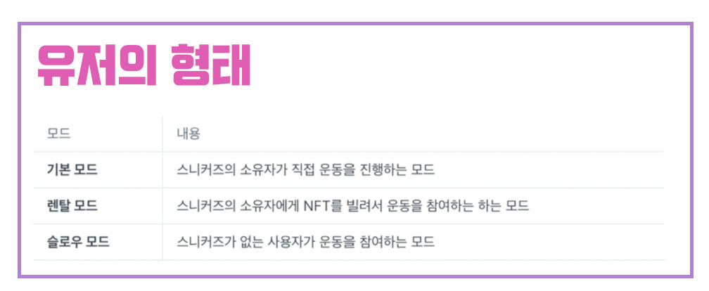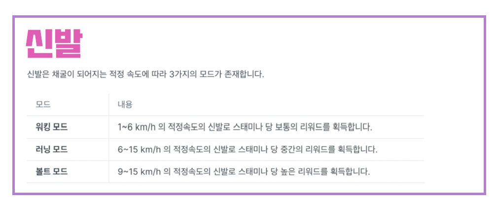 신발유형은 워킹모드, 러닝모드, 볼트모드로 나뉘어지며 빠르게 달리는 모드 일수록 높은 리워드가 획득이 가능하다.