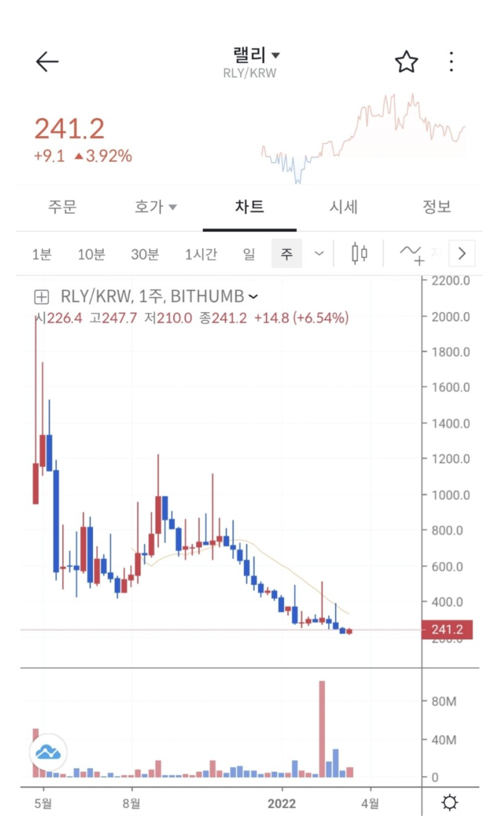 작년 5월 빗썸 거래소에 상장 후 상승장과 겹치며 상장빔을 맞아 2배이상 급등하였다. 이후 조정을 맞으며 400원대까지 거래가 되었다. 현재는 241,2원으로 상장이후 가장 저점을 보여주고 있다. (금리조정과 우쿠라이나-러시아)