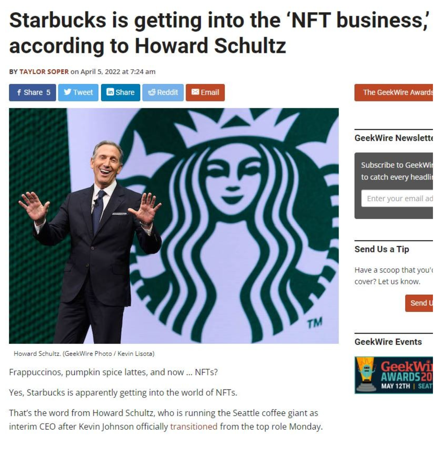 긱와이어(Geekwire)에 따르면 최근 CEO로 복귀한 슐츠CEO는 스타벅스 창업자는 연내 NFT 사업을 시작할 것이라고 밝혔다.