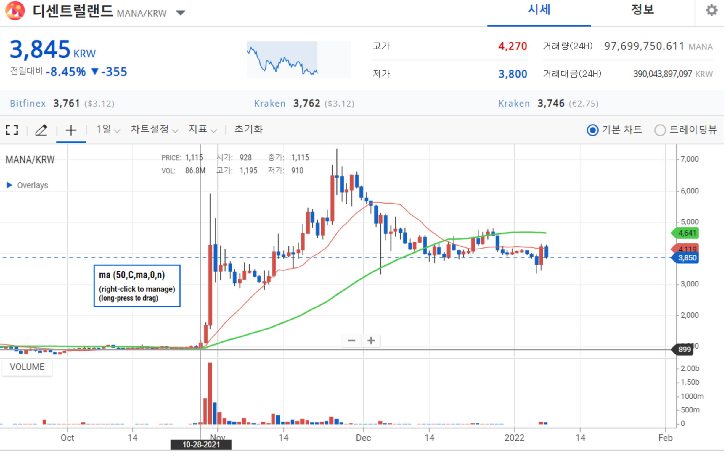 삼성의 호재소식으로 디센트럴랜드는 4,270원까지 상승하였다. 우리가 잘 알고 있는 대기업에서도 가상자산 시장에 진입을 했다니 더욱 기대가 되는것은 사실이다.