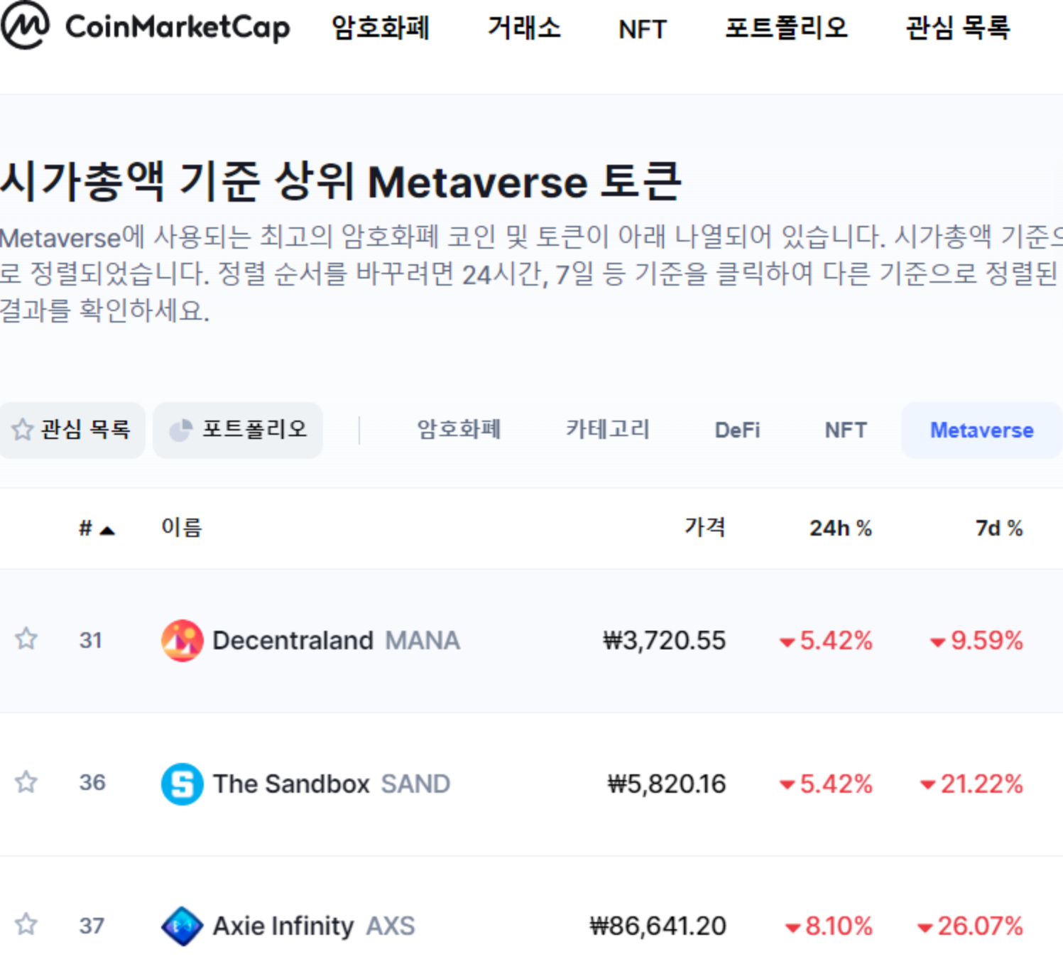 코인마켓캡의 메타버스 코인 순서를 보면 MANA가 1위를 차지하고 있다. 그 밑으로 샌드박스, 엑시인피니티 등이 순위권에 있다. 메타버스 세계에서 가장 앞서가는 디센트럴랜드는 앞으로 더욱 기대되는 코인 중 하나이다.