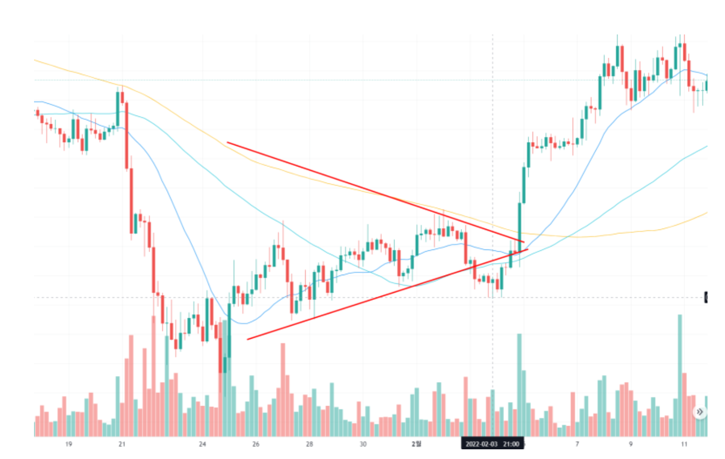차트 예시를 보면, 대칭형 삼각수렴 이후 끝 부분에서 큰 상승이 발생한 것으로 보인다.