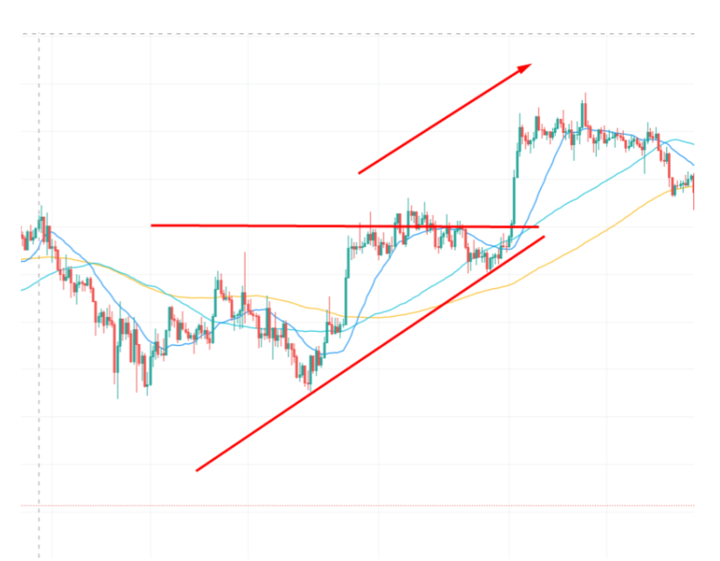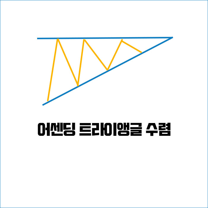 상승형 패턴을 의미한다. 전 고점들을 수평으로 유지하면서 저점만 높이면서 상승하는 삼각형 패턴으로 감각형이 수렴하는 지점 혹은 근방에서 강한 상승이 올 것이라고 예측한다.