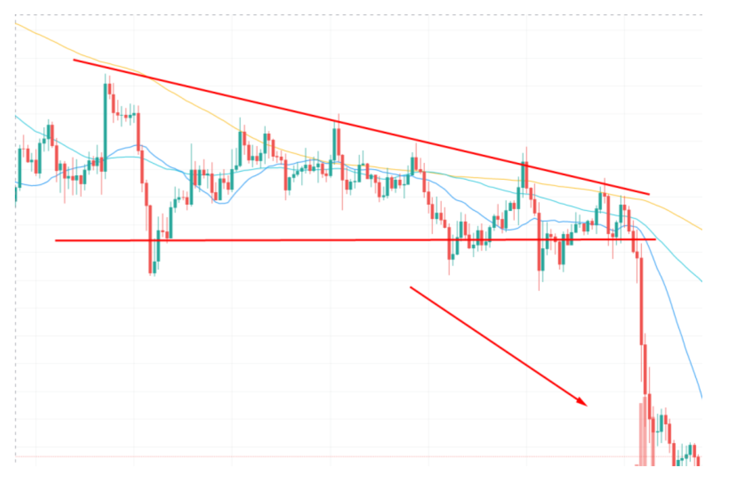 수평 지지선을 형성하고, 저항선은 점점 하락하는 형태를 말한다. 어센딩 트라이앵글 패턴 이후 하락한 것을 확인할 수 있다.
