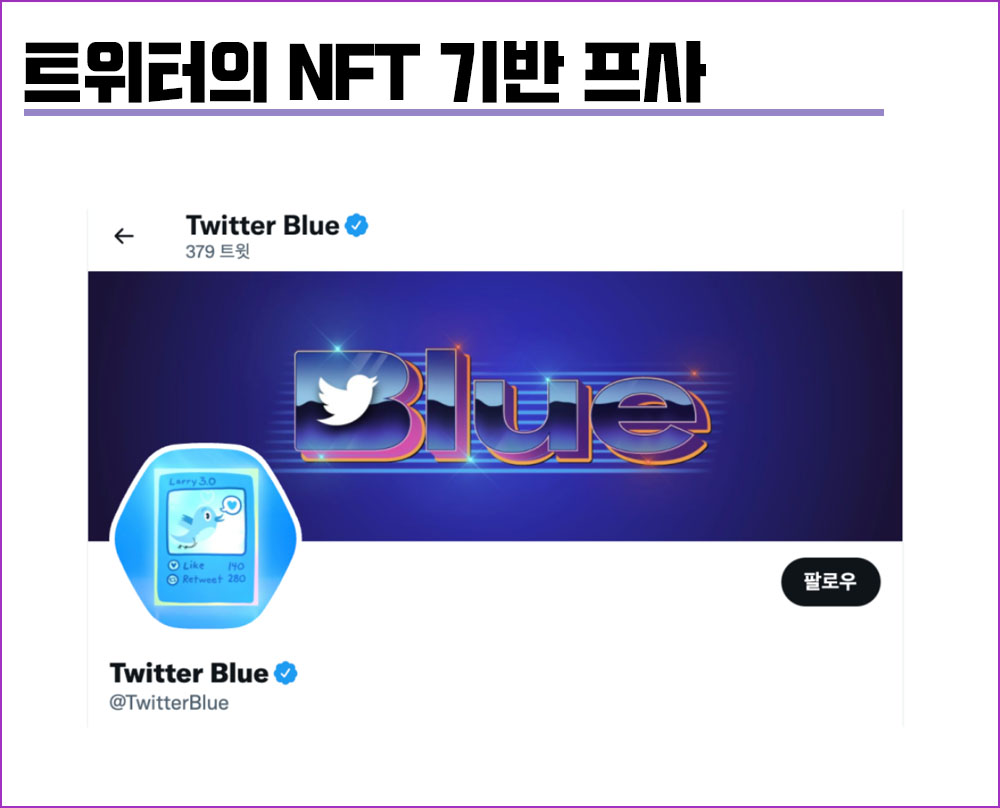 인스타그램 NFT 소식에 앞서 트위터에서는 NFT 기반 이미지를 자신의 트위터 프로필에 적용할 수 있도록 했다. 월2.99달러의 트위터 블루 구독 서비스에 가입하면, 자신의 트위터 프로필을 NFT 이미지로 변경할 수 있는 기능을 제공했다.