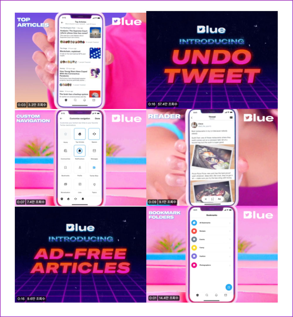 트위터 블루는 NFT 인증 프로필 서비스 뿐만 아니라 광고 제거, 탑 기사 모아보기, 북마크 기능 등이 있다. 아쉬운 점은 현재는 미국, 호주, 캐나다, 뉴질랜드에서만 이용할 수 있다. 한국에서도 서비스를 이용할 수 있는 날이 올 것 같다.