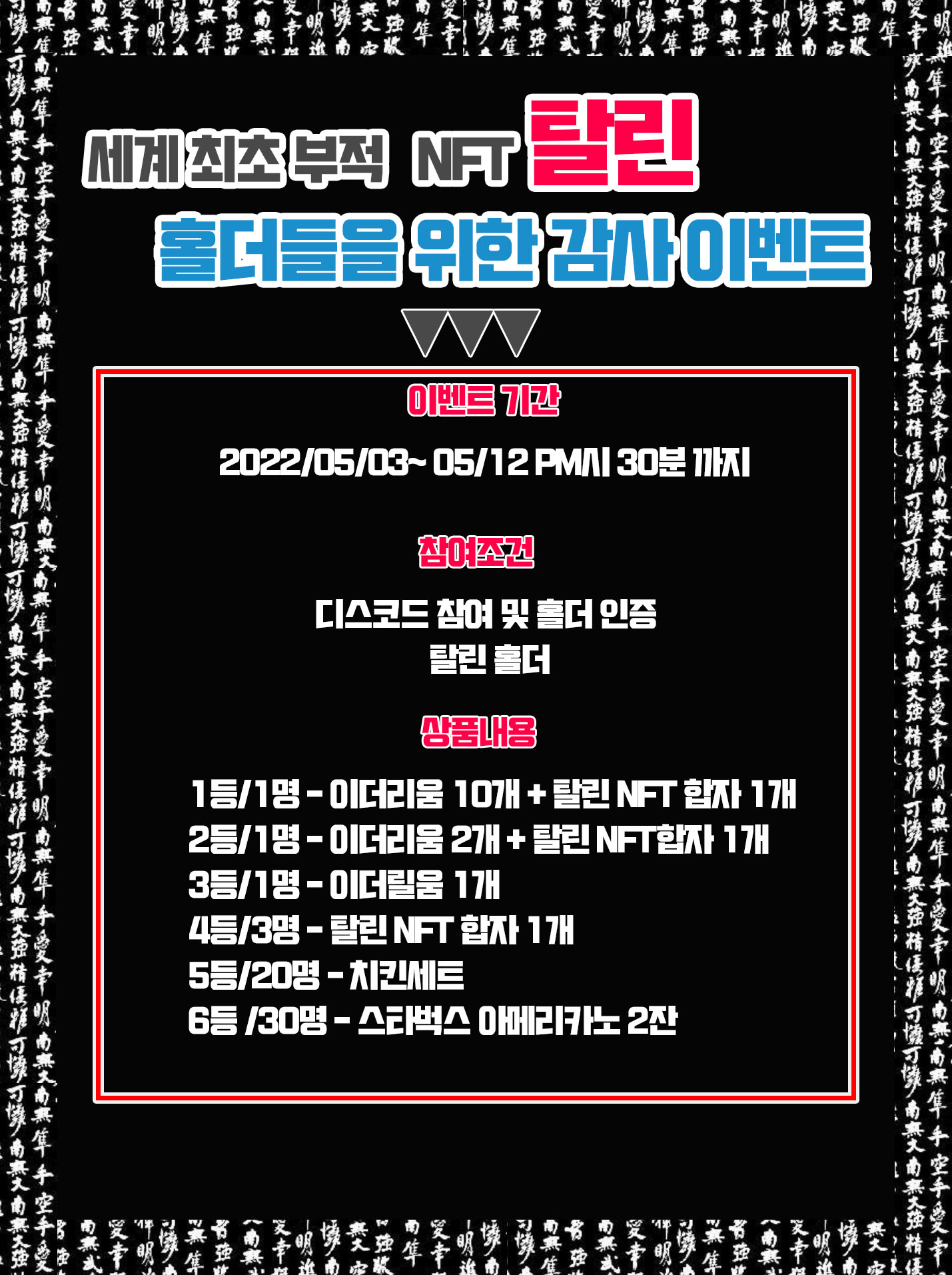 탈린(Talin) 세계 최초 행운 부적 NFT, 홀더 이벤트 :이더리움 10개