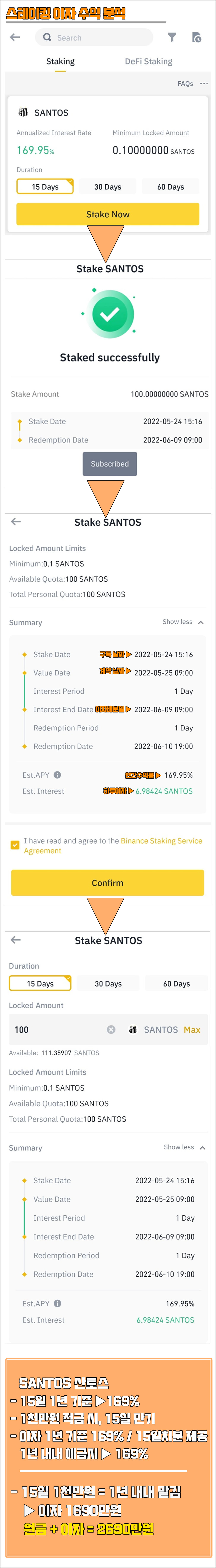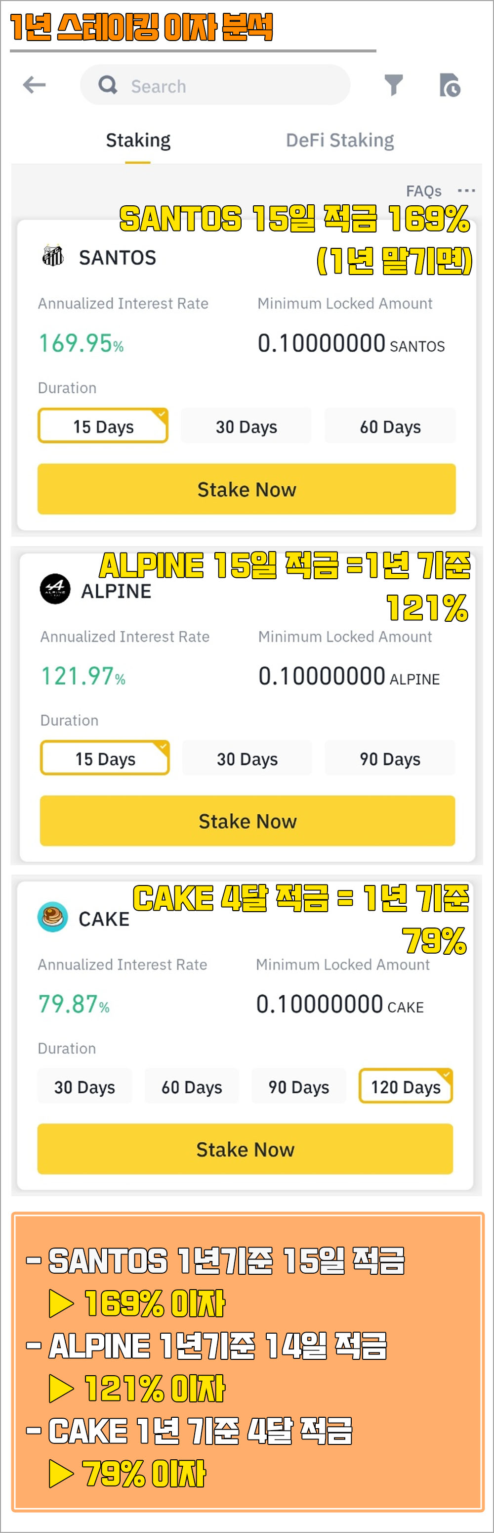 즉 15일, 1달, 2달, 3달, 4달 만기 시 이자는 1년 기준으로 15일치, 1달치, 2달치로 지급되고 연속 스테이킹으로 설정하거나 1년을 채우면 해당 이자율이 지급된다.