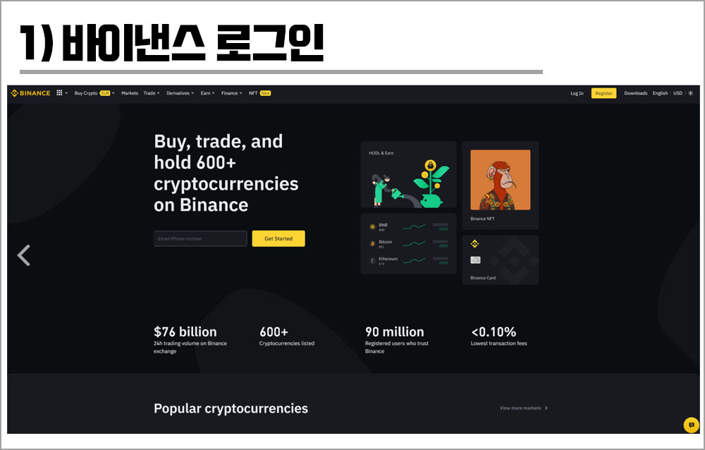 먼저 스테이킹을 하기 위헤서는 바이낸스 거래소로 접속해야한다. 기존의 회원이라면 바로 접속 후 로그인하면 되고 아