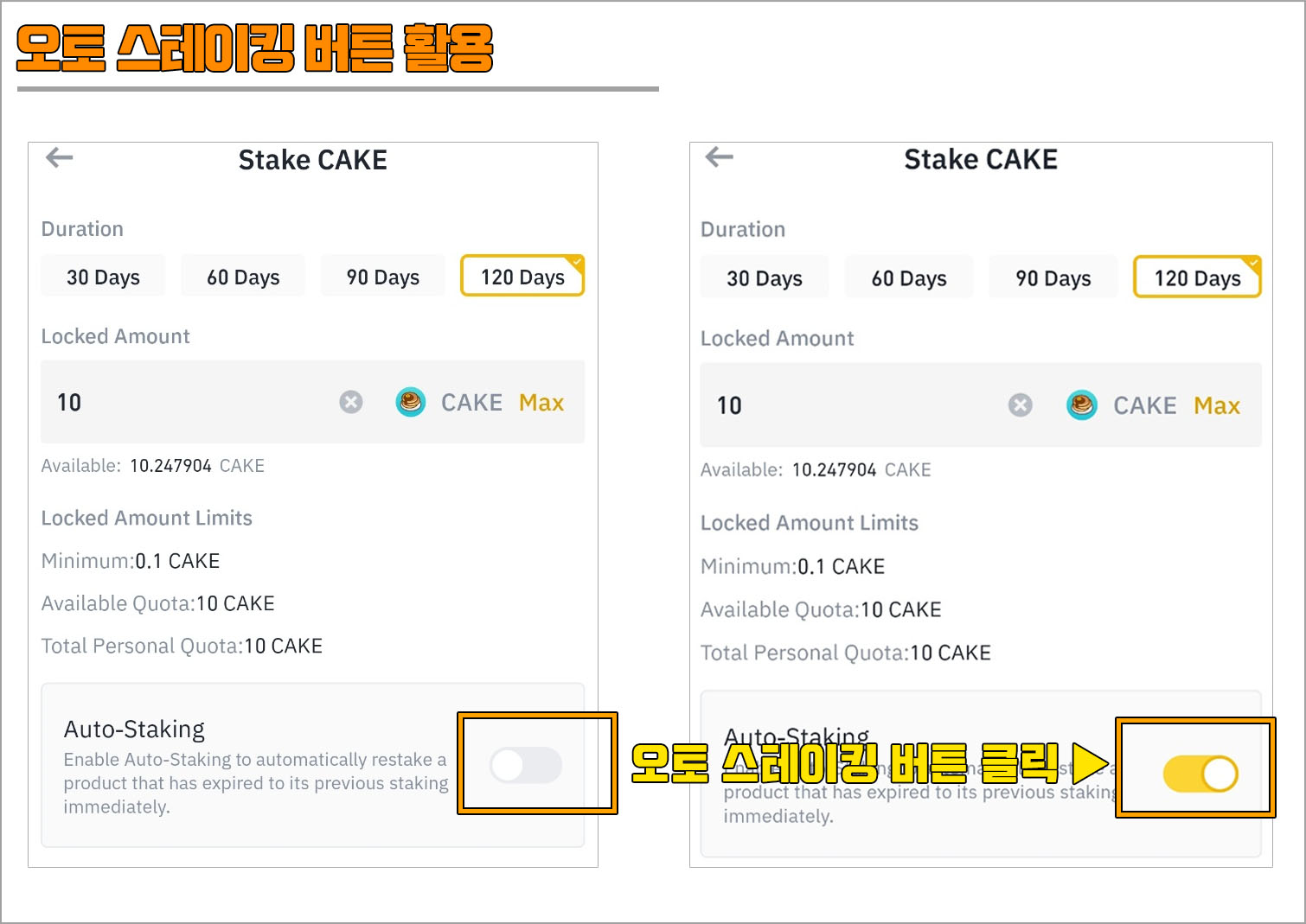 오토 스테이킹 버튼을 누르면, 계속 기간이 채워지고 나서 계속 스테이킹이 이어진다.