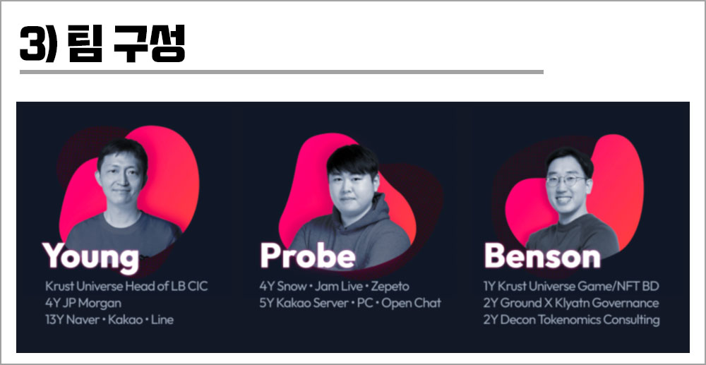 팀 구성원은 현재 3명으로 공개되었다. 모두 카카오, 크러스트, 그라운드 X 출신이다. 신상공개가 성공과 직결되는 것은 아니지만 신상을 오픈했다는 것만으로도 어느정도의 신뢰가 깔린다.