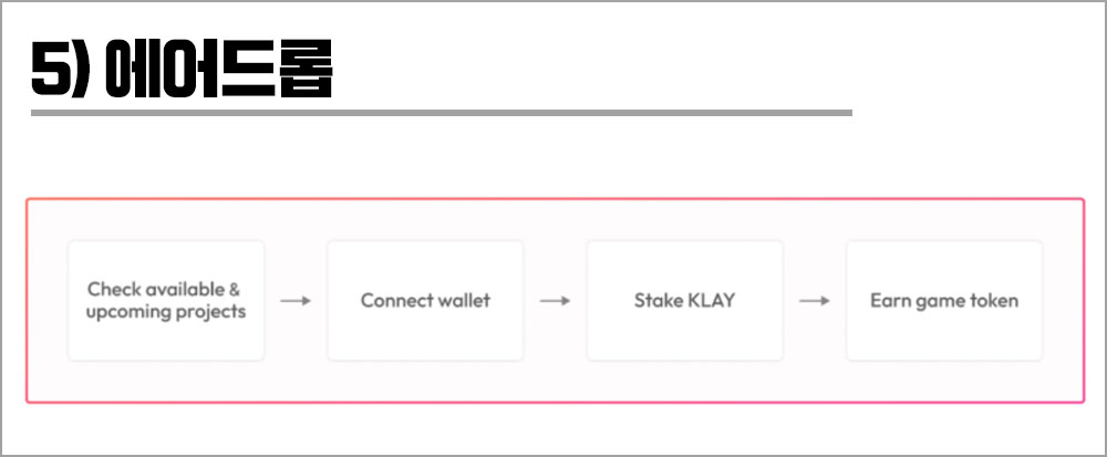 스테이킹을 통한 에어드랍은 클레이튼 게임즈의 네이티브 토큰을 스테이킹하게 되면 게임 개발사의 토큰을 받을 수 있다. 첫 에어드랍 토큰으로는 넷마블의 MBX가 예정이다.