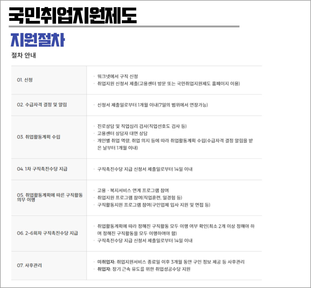 ①국민취업지원제도 신청 → ②수급자격 결정 및 알림 → ③ 취업활동 계획 수립→ ④ 1차 구직촉진수당 지급 → ⑤ 취업활동계획에 따른 구직활동 의무 이행→ ⑥ 2~6회차 구직촉진수당 지급→ ⑦ 사후관리