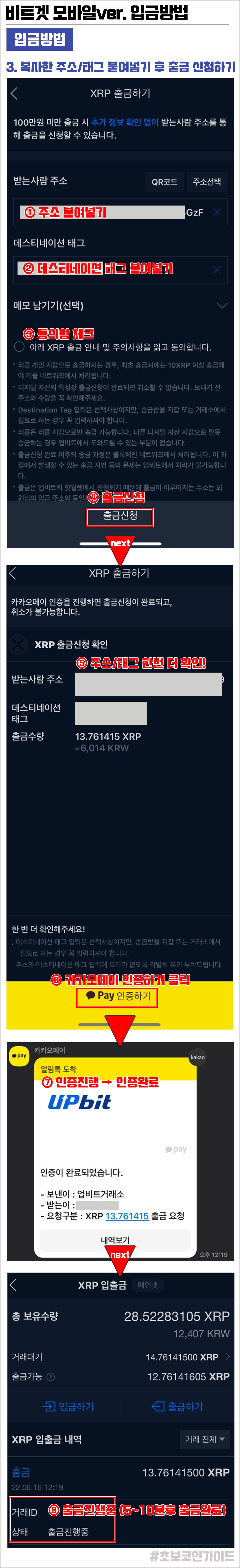 3) 복사한 XRP 주소/태그 붙여넣기 후 출금 신청하기