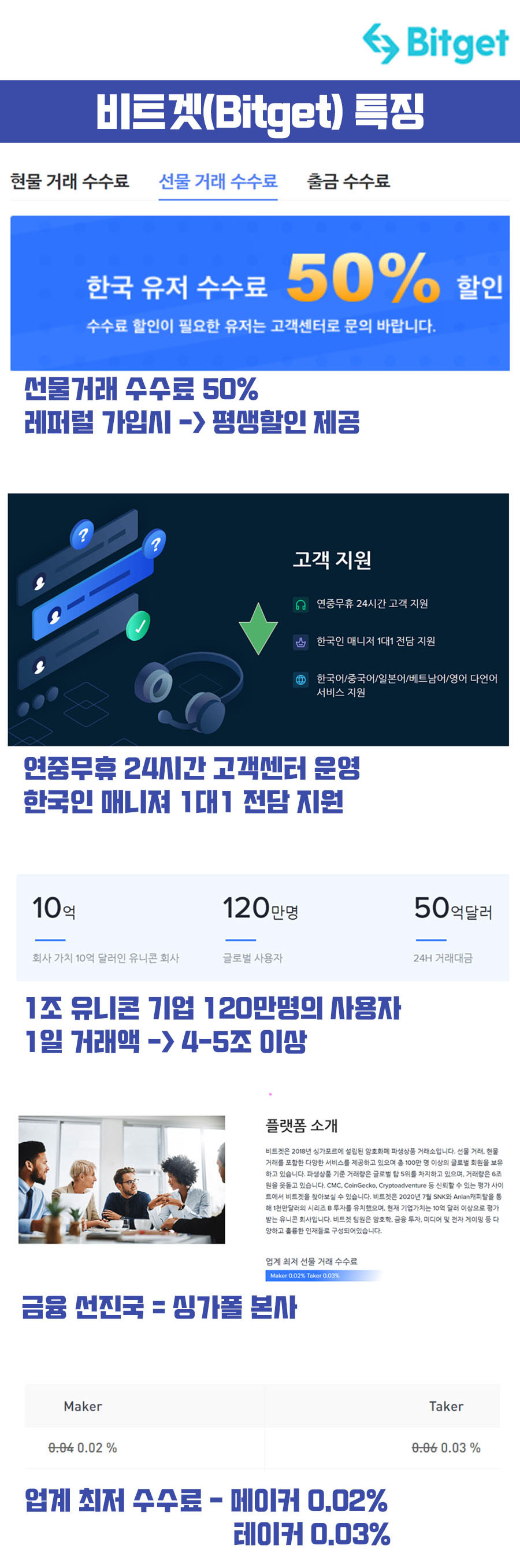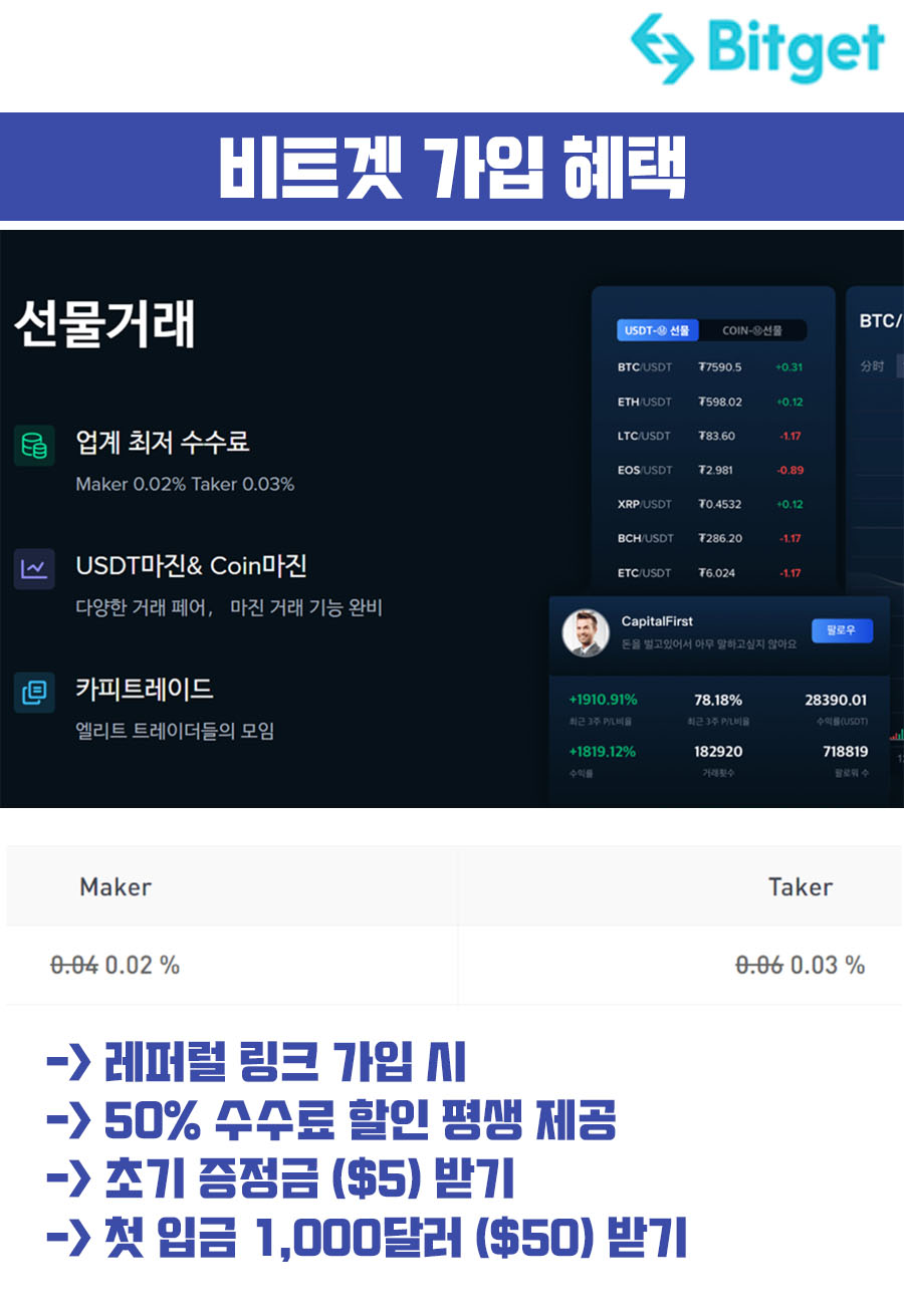 - 비트겟 거래소의 특징은 한국인을 대상으로 선물 50% 수수료 할인을 제공한다.