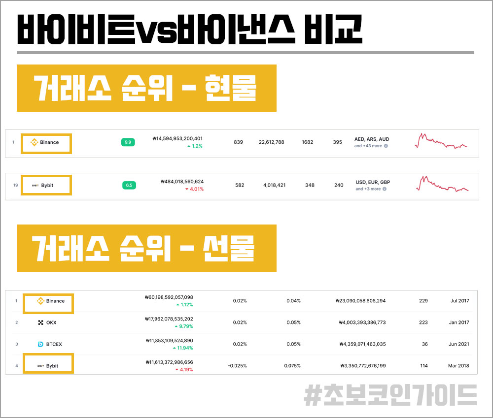 현물 순위는 바이낸스가 단연 1등이고 바이비트의 경우 19등 정도이다. 반면에 선물 거래 순위는 바이낸스가 1등, 바이비트도 4등으로 상위권에 속한다.