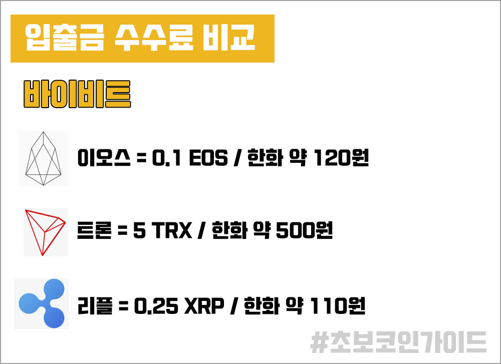 이오스, 리플은 같지만 트론은 바이비트는 5 TRP로 한화 약 500원, 바이낸스는 1 TRX로 한화 약 100원으로 차이점을 보인다.