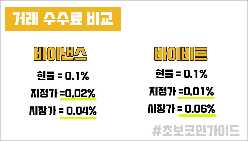 입출금 수수료는 코인에 따라서 바이낸스가 저렴한 경우가 있고 거래수수료는 지정가는 바이비트 시장가는 바이낸스가 저렴하다.