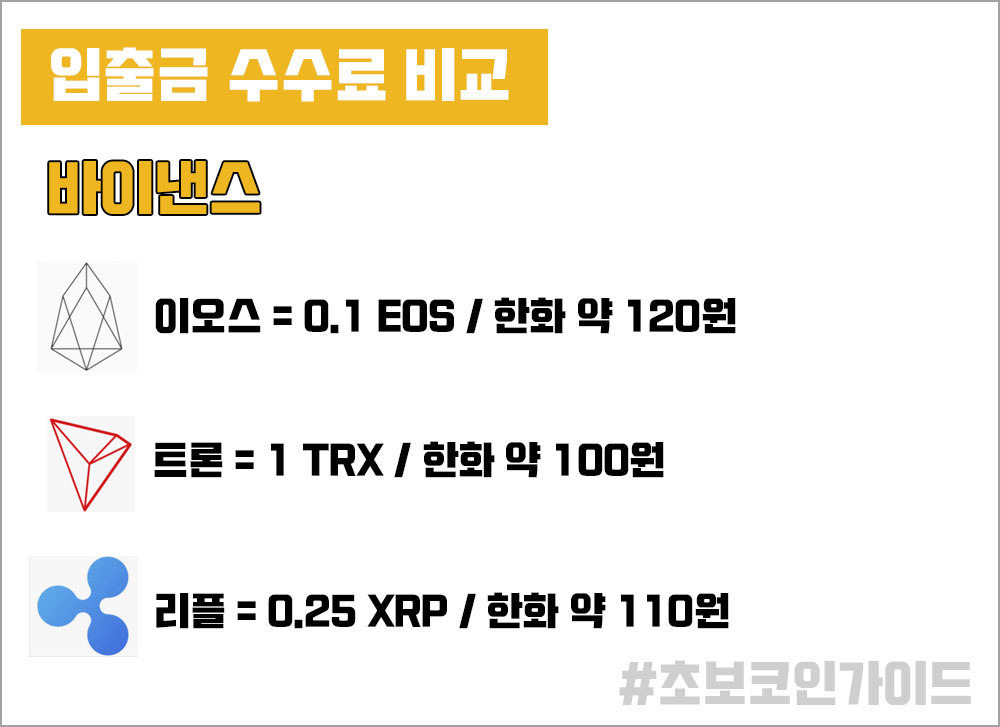 모든 코인 수수료를 모두 비교하지 않고 초보코인가이드에서 평소 추천하는 리플, 트론, 이오스만 비교해보자.