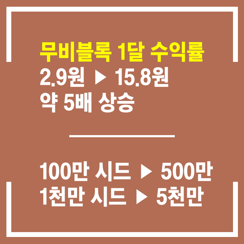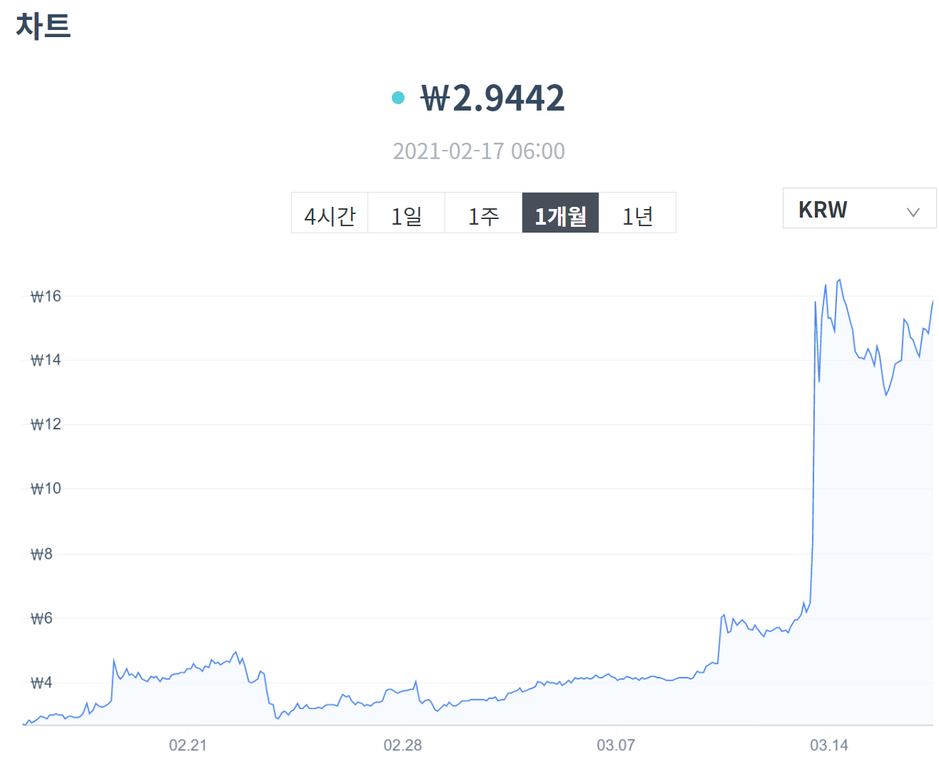 1달 전의 무비블록은, 2월 17일에 2.9원이 최저점으로 현재의 가격인 15.8원과 비교시 약 5배가 상승하였다.