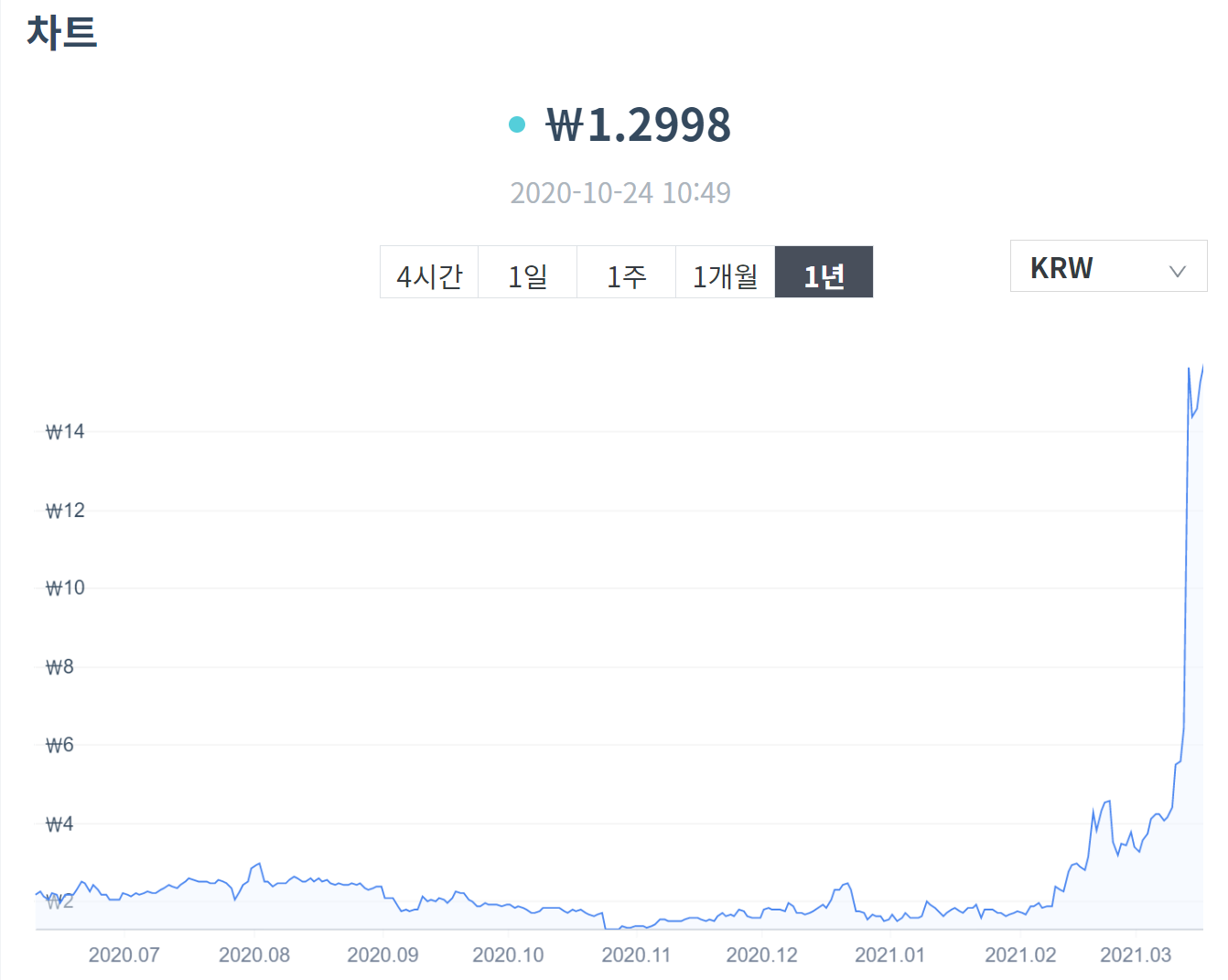 1년간의 무비블록 시세 추이는, 최저점이 작년 10월 24일 약 1.3원에서 현재가를 비교시, 15배가 올랐다.