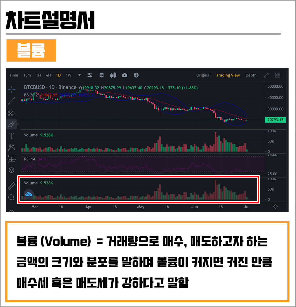 볼륨은 거래량을 뜻하며 매수, 매도하고자 하는 금액의 크기와 분포를 말한다. 볼륨이 커지면(넓이가 넓어지면) 그 만큼 매수세 혹은 매도세가 강하다고 말한다. 볼륨없이 올라가는 차트보다는 볼륨있이 올라가는 차트가 안정적인 차트이다. 하락장에서도 볼륨이 얼마나 붙었느냐에 따라 차트의 흐름 확신성 여부를 판가름 할 수 있다.