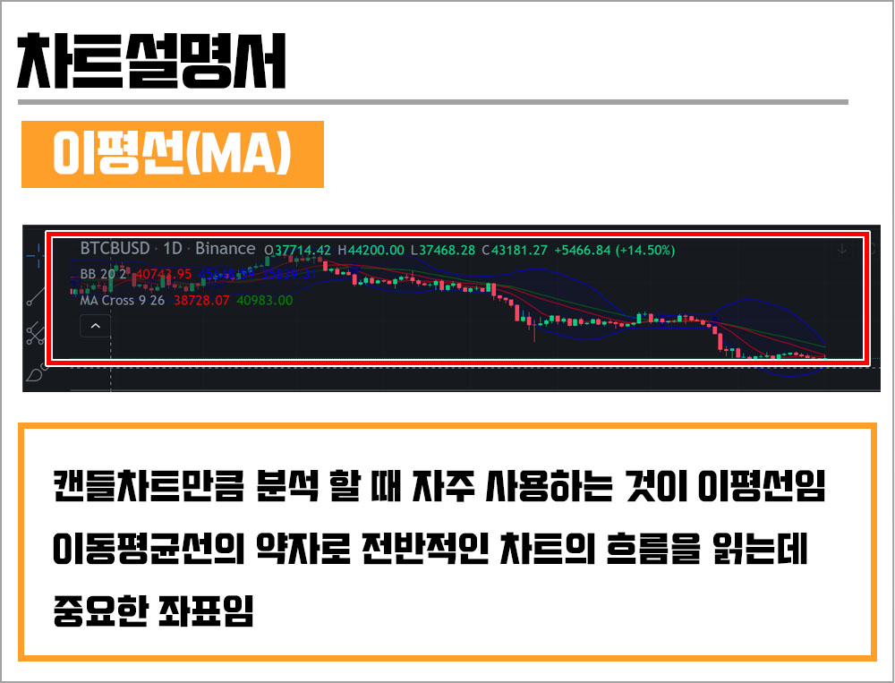 캔들차트 다음으로 분석 할 때 자주 사용하는 것이 이평선이다. 이동평균선의 약자로 전반적인 차트의 흐름을 읽는데 중요한 좌표이다.