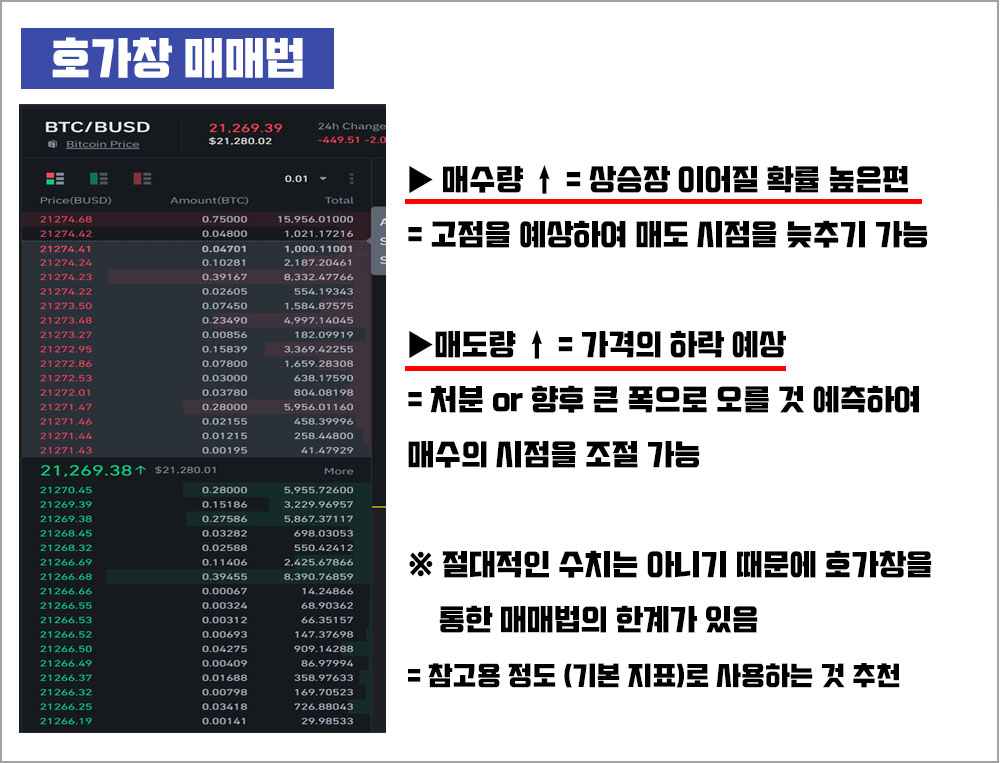 - 호가창 : 암호화폐 시장에서 매수 또는 매도 할 때 부르는 가격을 표시한 창