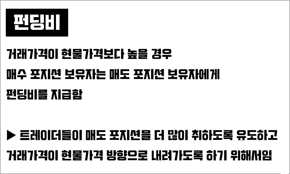 거래가격이 현물가격보다 낮을 경우 매도 포지션 보유자는 매수 포지션 보유자에게 펀딩비를 지불하게 되며 매수 포지션 보유자가 포지션을 더 많이 취하도록 유도하는 것이 펀딩비이다.