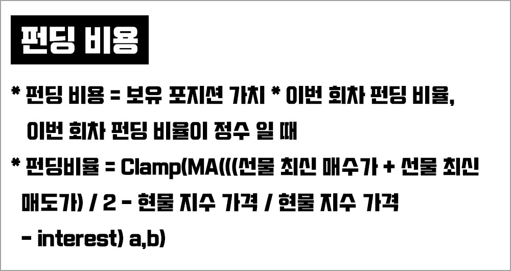 * 펀딩 비율 = Clamp(MA(((선물 최신 매수가+선물 최신 매도가) / 2 - 현물 지수 가격) / 현물 지수 가격 - Interest). a, b)