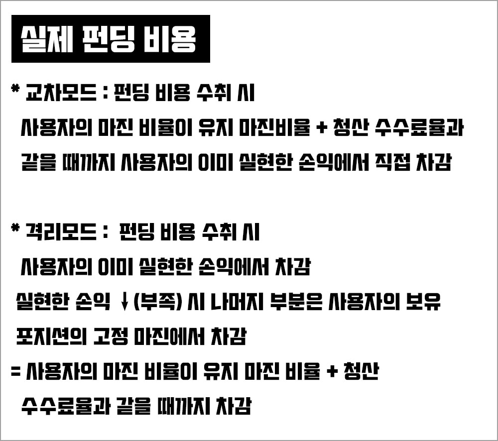 * 격리모드 : 펀딩 비용 수취 시 사용자의 이미 실현한 손익에서 차감 실현한 손익 ↓(부족) 시 나머지 부분은 사용자의 보유