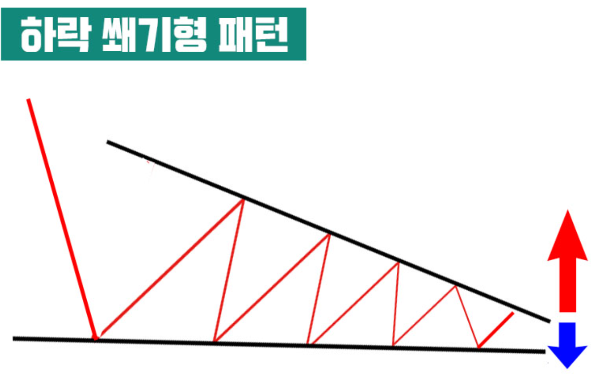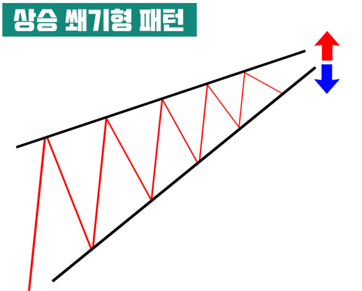 쐐기형 패턴은 영어로 Wedge를 뜻하며 여성 구두 웨지힐 모양처럼 지지선과 저항선이 움직이는 차트를 뜻한다.